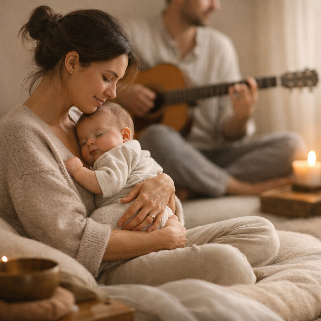 Euterpia Baby est une séance musicale privée de 15 à 20 minutes, conçue pour éveiller l’écoute du nouveau-né et soutenir le lien parent-bébé dans un environnement doux et sécurisé.